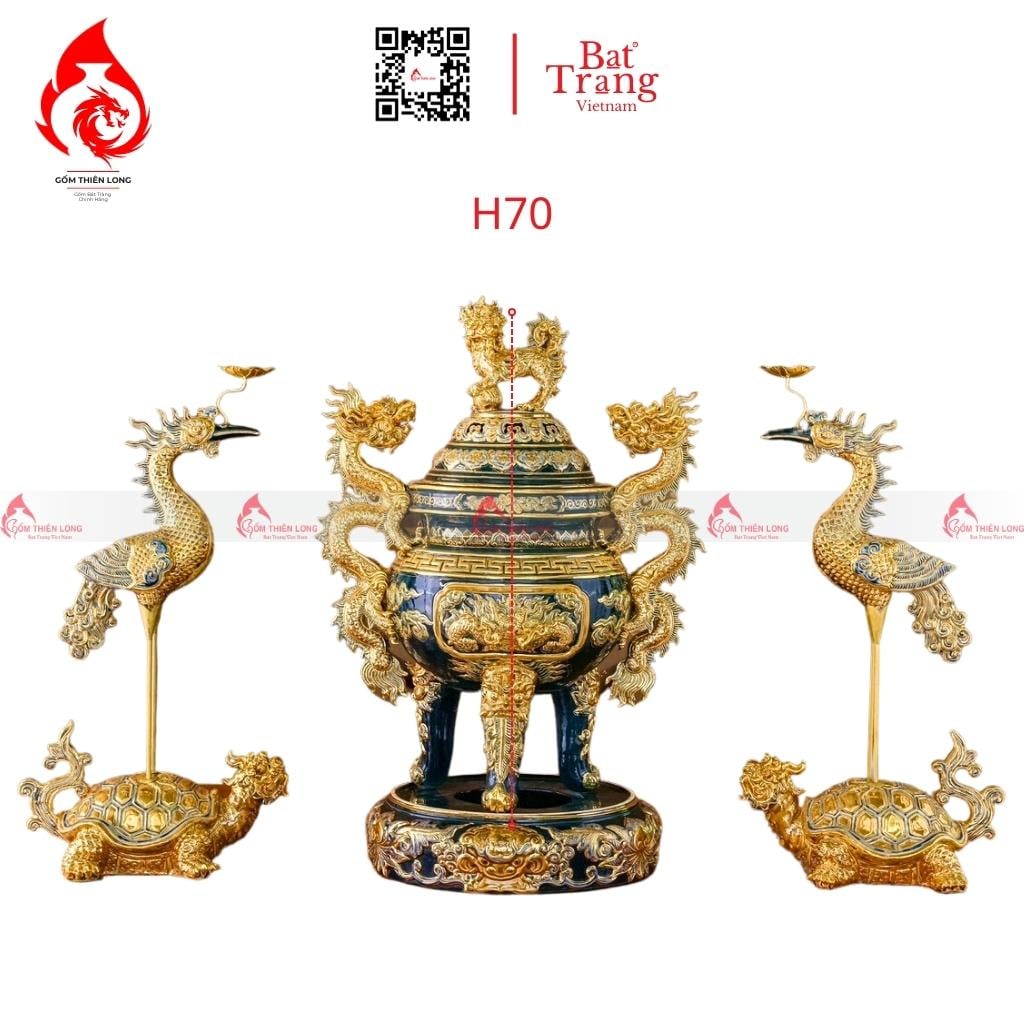Bộ đỉnh hạc thờ bằng sứ men xanh coban vẽ vàng Bát Tràng có nhiều kích thước và mẫu mã khác nhau, phù hợp với nhiều không gian thờ cúng và kích thước ban thờ.