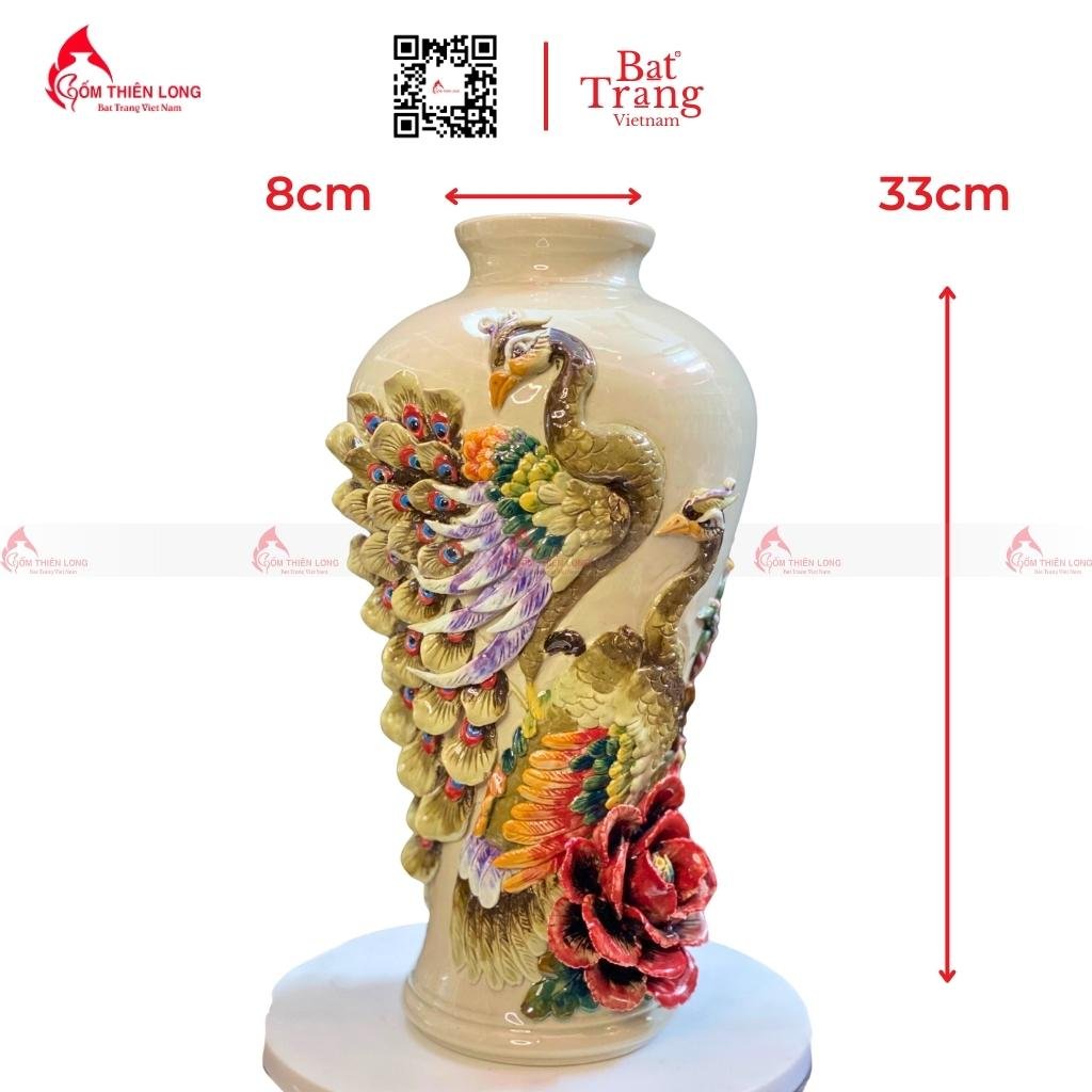 Bình gốm vuốt tay Bát Tràng họa tiết công hoa phú quý là một tác phẩm nghệ thuật thủ công tinh xảo và độc đáo. Bình được làm từ chất liệu gốm cao cấp, có hoa văn tinh tế và sắc nét. Đôi chim công được đắp tay một cách khéo léo và đẹp mắt, tạo nên một bức tranh sống động và đầy màu sắc.
