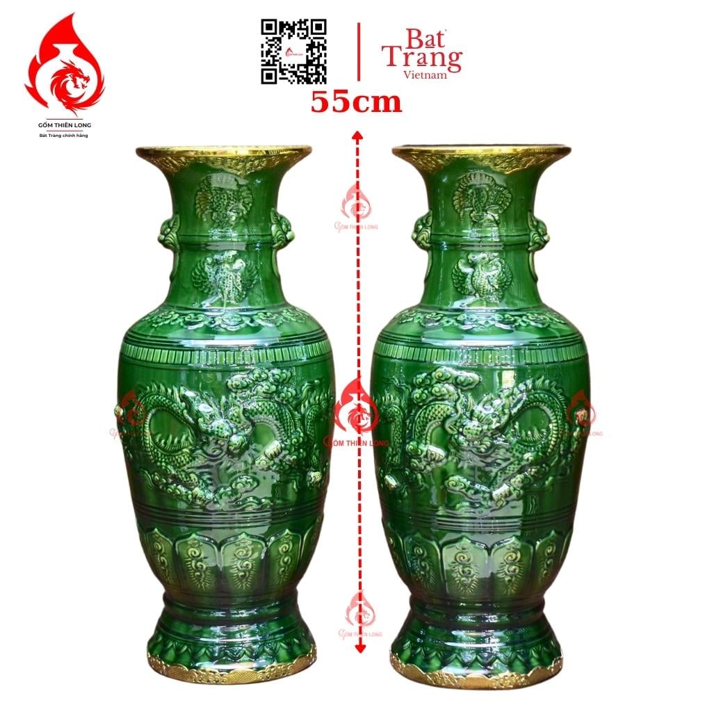 Lục bình để bàn thờ men xanh ngọc lục bảo nhất long Bát Tràng có nhiều kích thước khác nhau, phù hợp với nhiều không gian bàn thờ. Loại lục bình này thường được đặt ở 2 bên bàn thờ, đối xứng nhau, giúp tạo sự cân đối, hài hòa cho không gian thờ cúng.