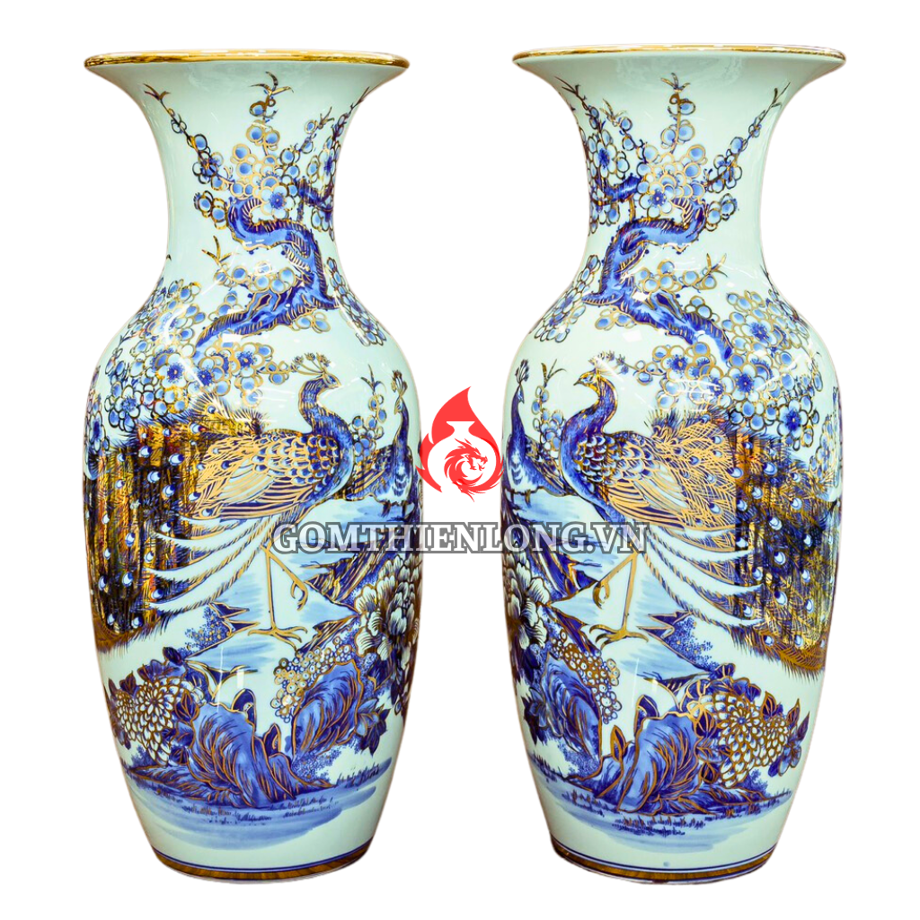 Lục bình để bàn thờ men lam vẽ vàng công hoa phú quý Bát Tràng là một trong những vật dụng thờ cúng phổ biến trong văn hóa người Việt. Loại lục bình này được làm từ chất liệu gốm sứ Bát Tràng cao cấp, với màu men lam đặc trưng và họa tiết hoa đào cùng đôi chim công tinh xảo được người nghệ nhân vẽ hoàn thiện sau nhiều ngày công phu vô cùng.