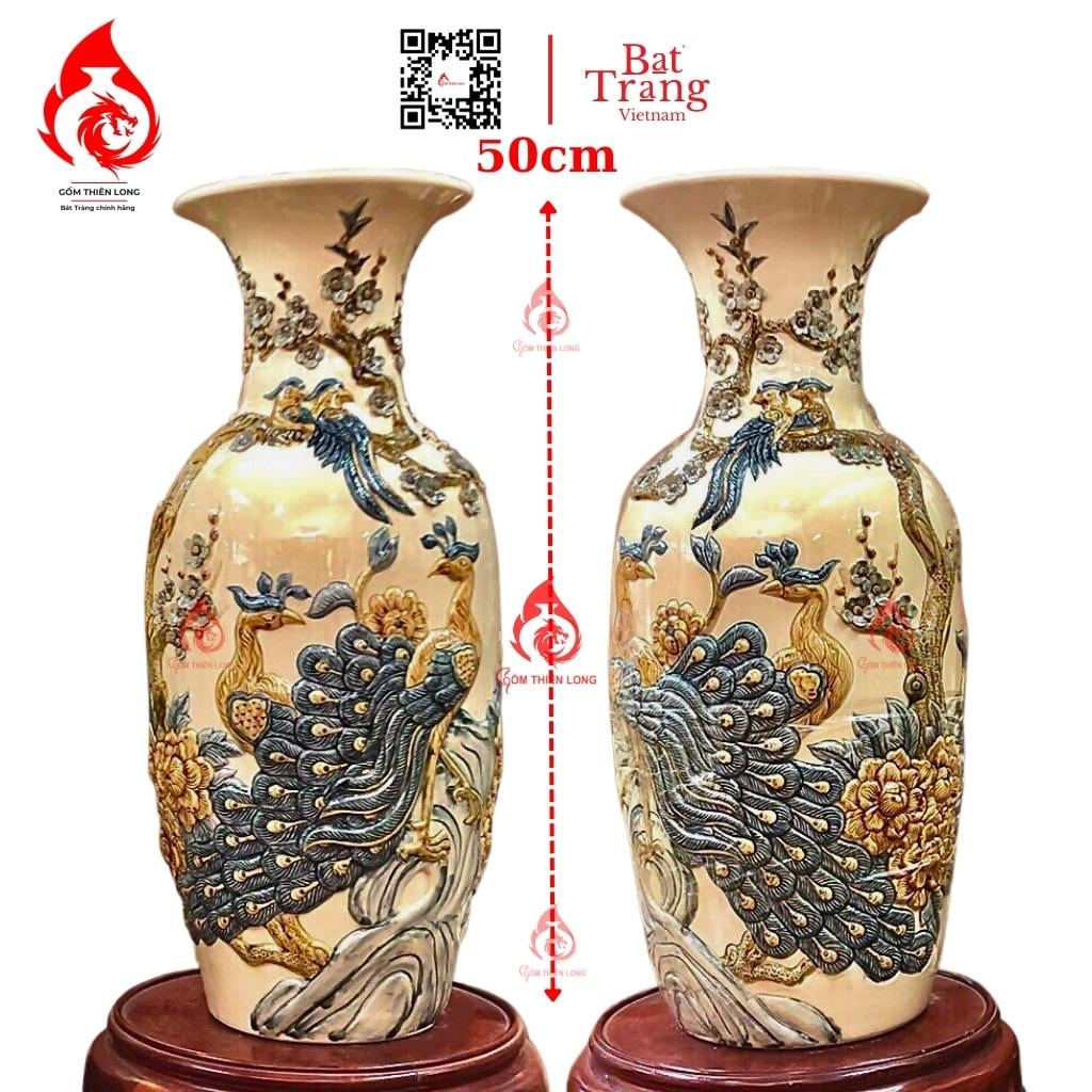Lục bình để bàn thờ men rạn bóng công hoa phú quý Bát Tràng là một trong những vật dụng thờ cúng phổ biến trong văn hóa người Việt. Loại lục bình này được làm từ chất liệu gốm sứ Bát Tràng cao cấp, với màu men rạn đặc trưng và họa tiết hoa đào cùng đôi chim công tinh xảo được người nghệ nhân đắp hoàn thiện sau nhiều ngày công phu vô cùng.