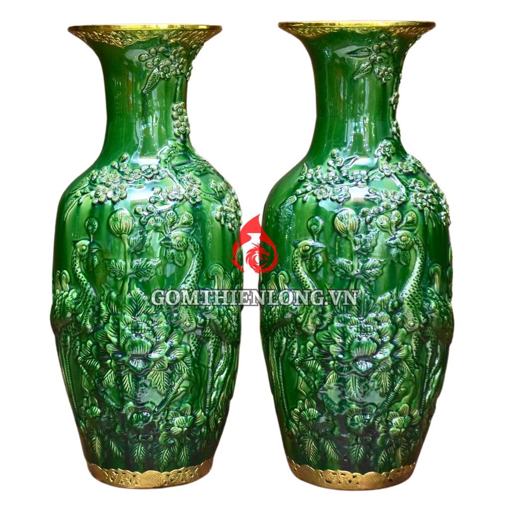 Lục bình để bàn thờ men xanh ngọc lục bảo công hoa phú quý Bát Tràng là một trong những bảo vật thờ cúng mà rất nhiều gia đình Việt muốn thỉnh về. Loại lục bình này được làm từ chất liệu gốm sứ Bát Tràng cao cấp, với màu xanh ngọc lục bảo quý hiếm và họa tiết hoa đào cùng đôi chim công tinh xảo được người nghệ nhân đắp hoàn thiện sau nhiều ngày công phu vô cùng.