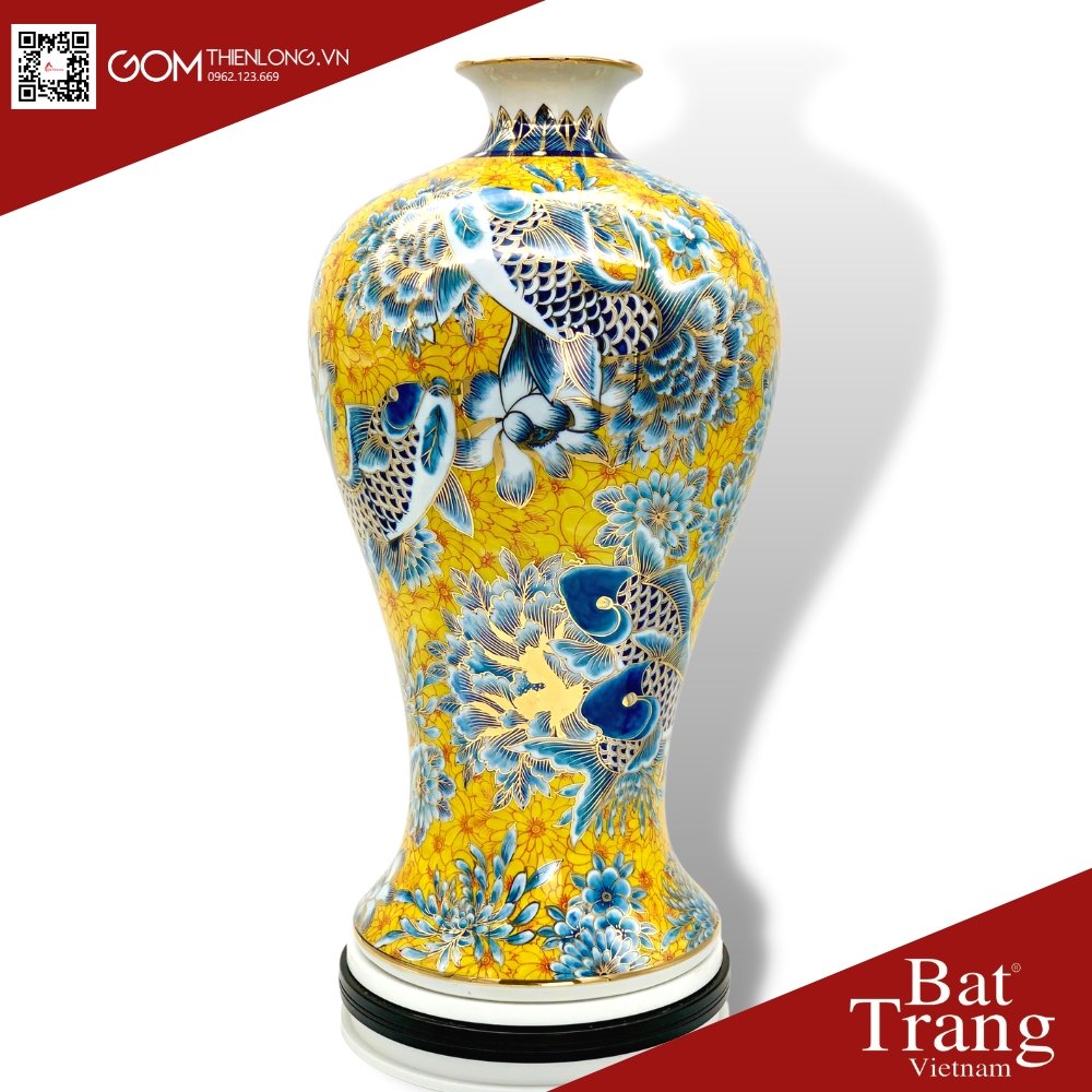 Mai bình tài lộc niên niên hữu dự vẽ vàng nền vàng là một vật phẩm phong thủy được khách hàng đánh giá cao và nằm trong nhóm linh phẩm được ưa chuộng và yêu thích nhất. Bởi sức hút của chiếc mai bình tài lộc này có được là nhờ vẻ đẹp tinh xảo, mang đậm chất nghệ thuật và sáng tạo đặc trưng của gốm Bát Tràng.