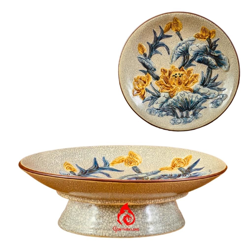 Mâm bồng sứ men rạn đắp nổi hoa sen bảo hành 3 năm