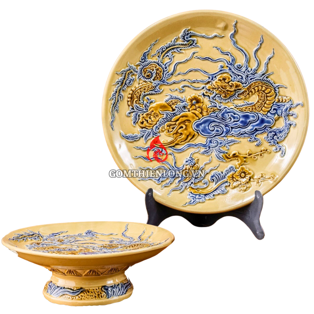 Tìm hiểu mâm bồng sứ Bát Tràng men vàng hoàng tộc đắp nổi rồng phượng: