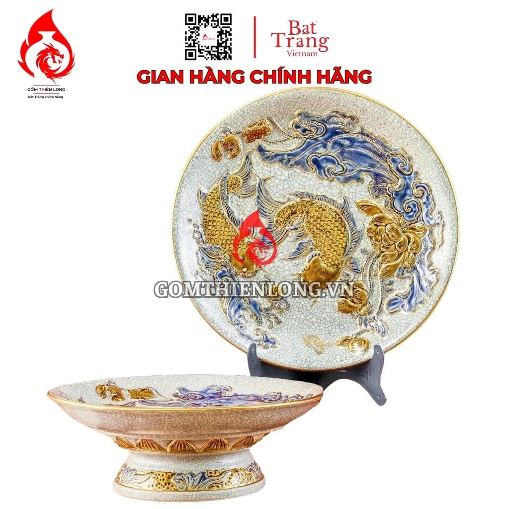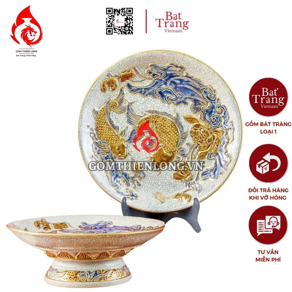 Thông tin sản phẩm Mâm Bồng Sứ Bát Tràng Men Rạn Đắp Nổi Vẽ Vàng Sen Cá 231117