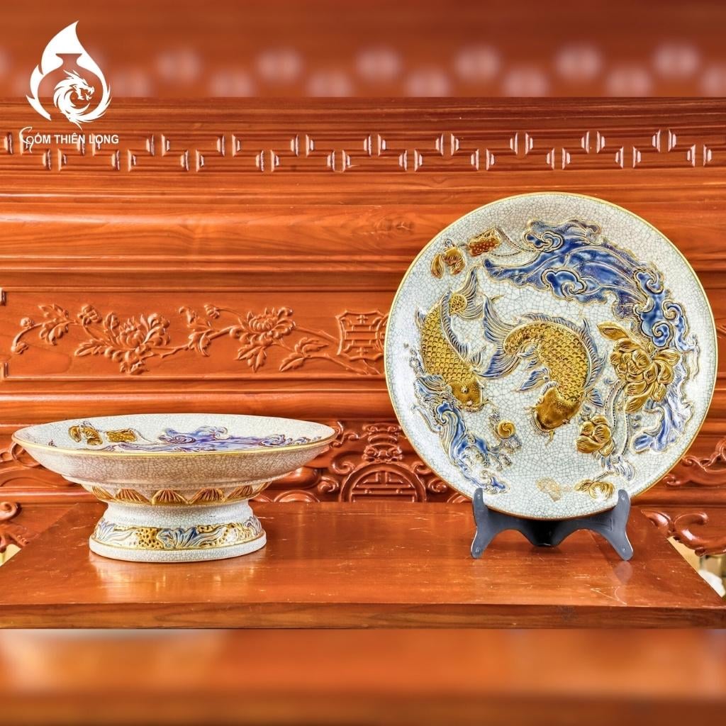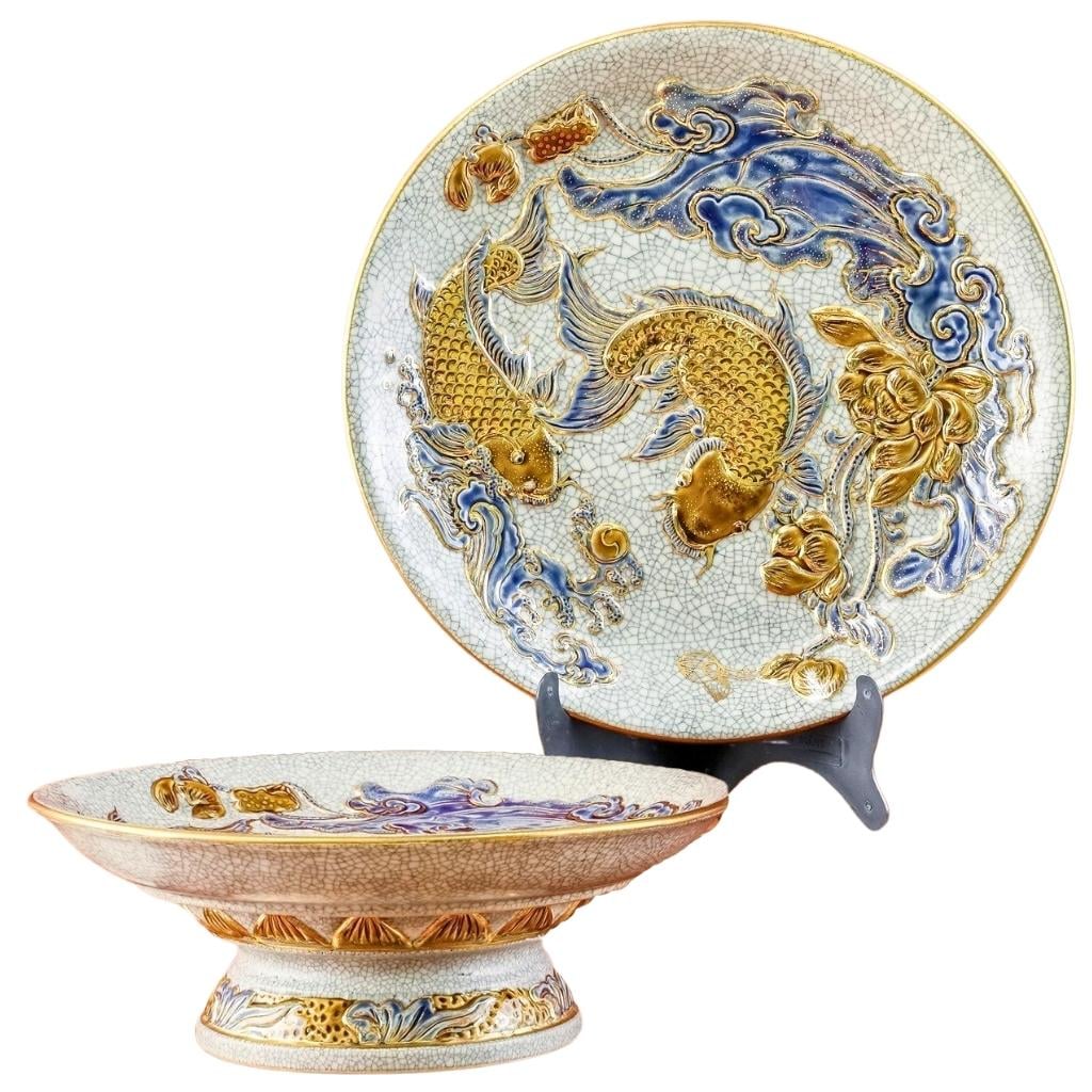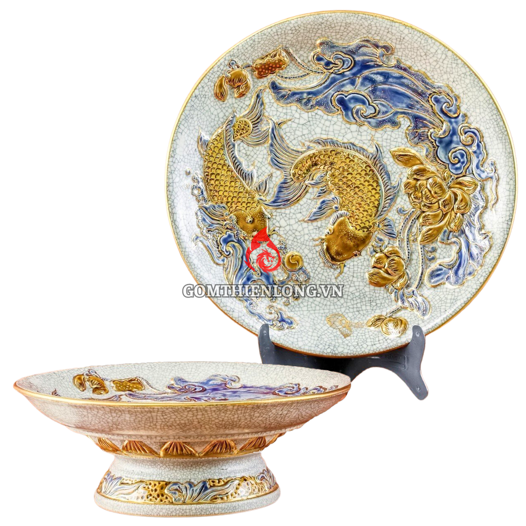 Tìm hiểu mâm bồng sứ Bát Tràng men rạn đắp nổi vẽ vàng sen cá:
