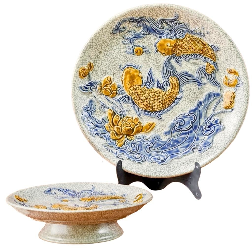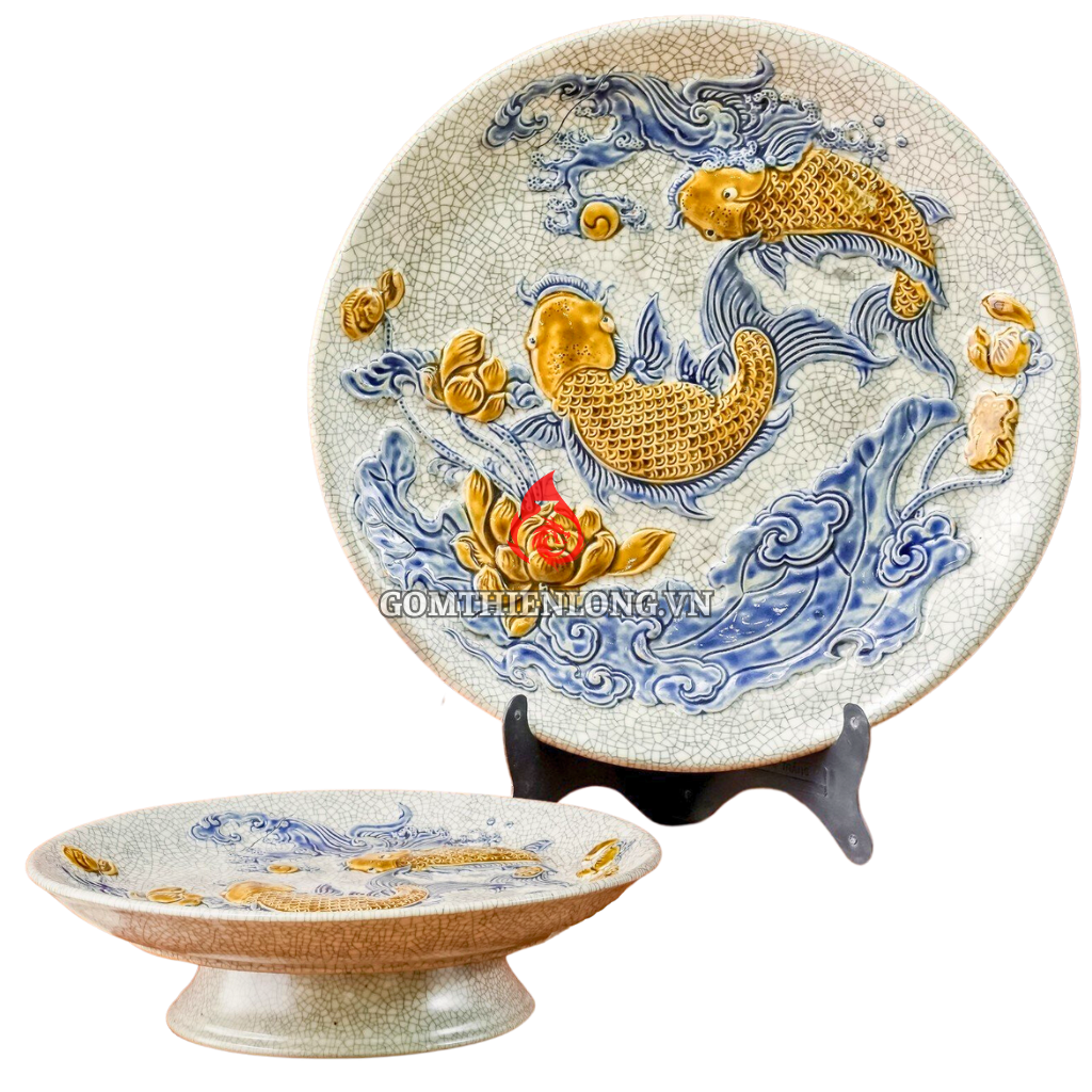 Tìm hiểu mâm bồng sứ Bát Tràng men rạn đắp nổi sen cá: