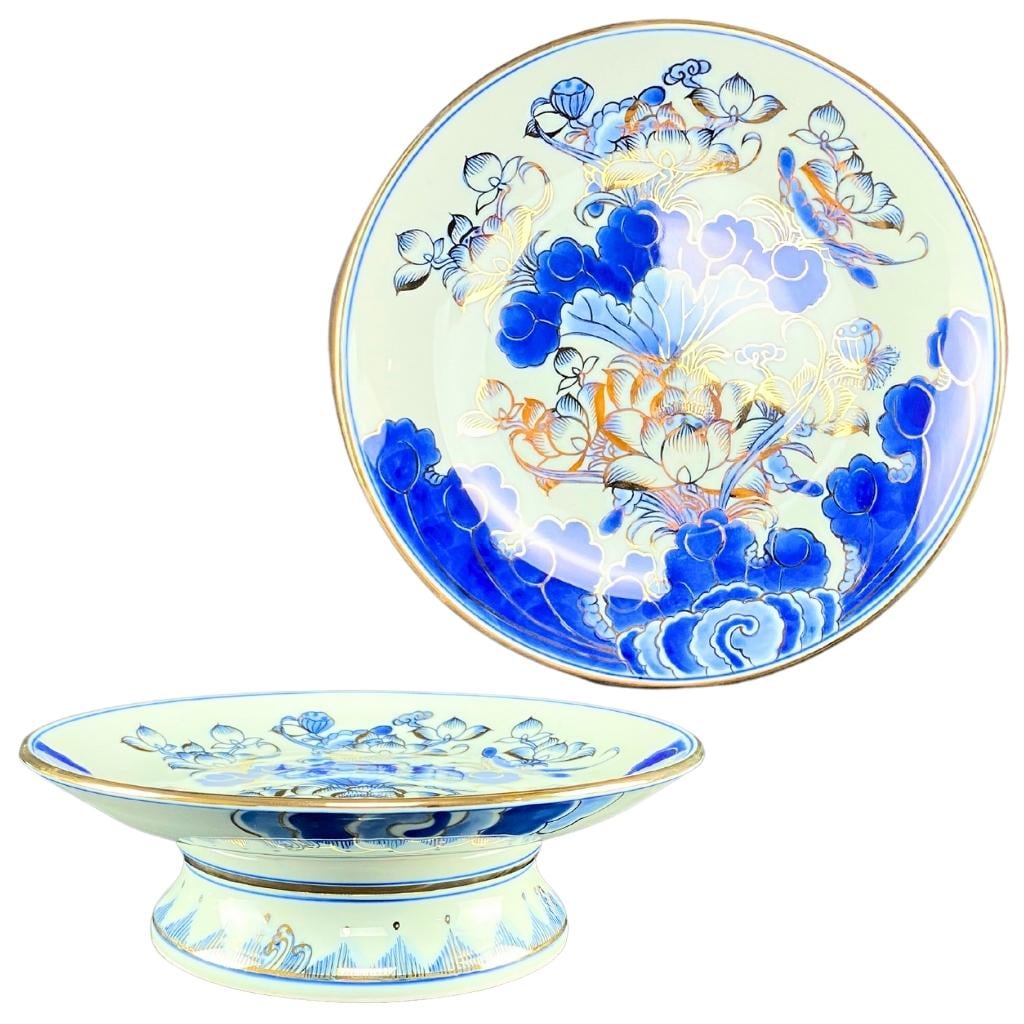 Mâm Bồng Sứ Bát Tràng Men Xanh Lam Vẽ Vàng Hoa Sen 230879