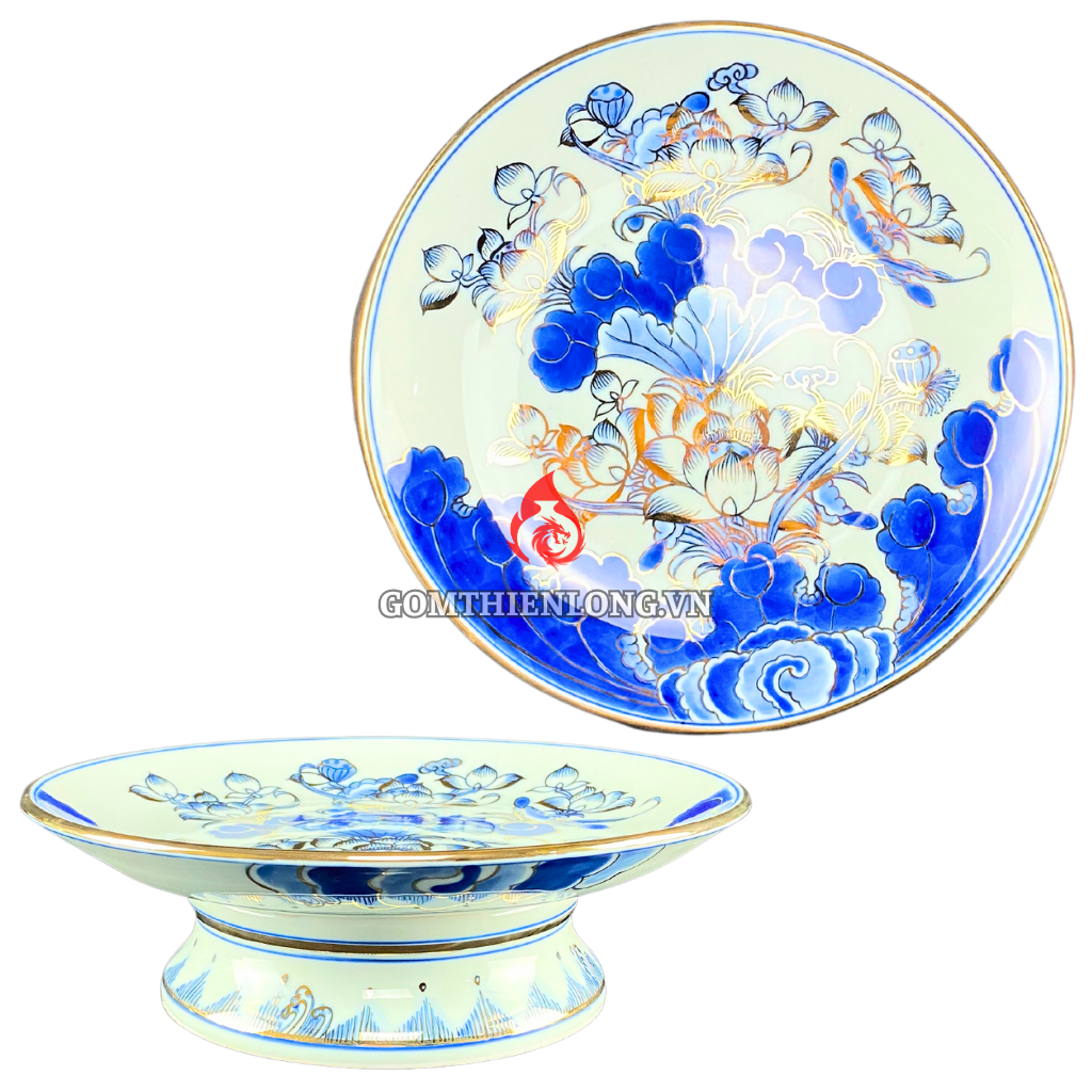 Mâm Bồng Sứ Bát Tràng Men Xanh Lam Vẽ Vàng Hoa Sen 230878