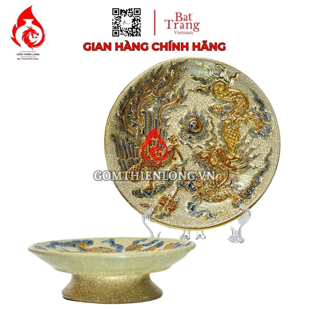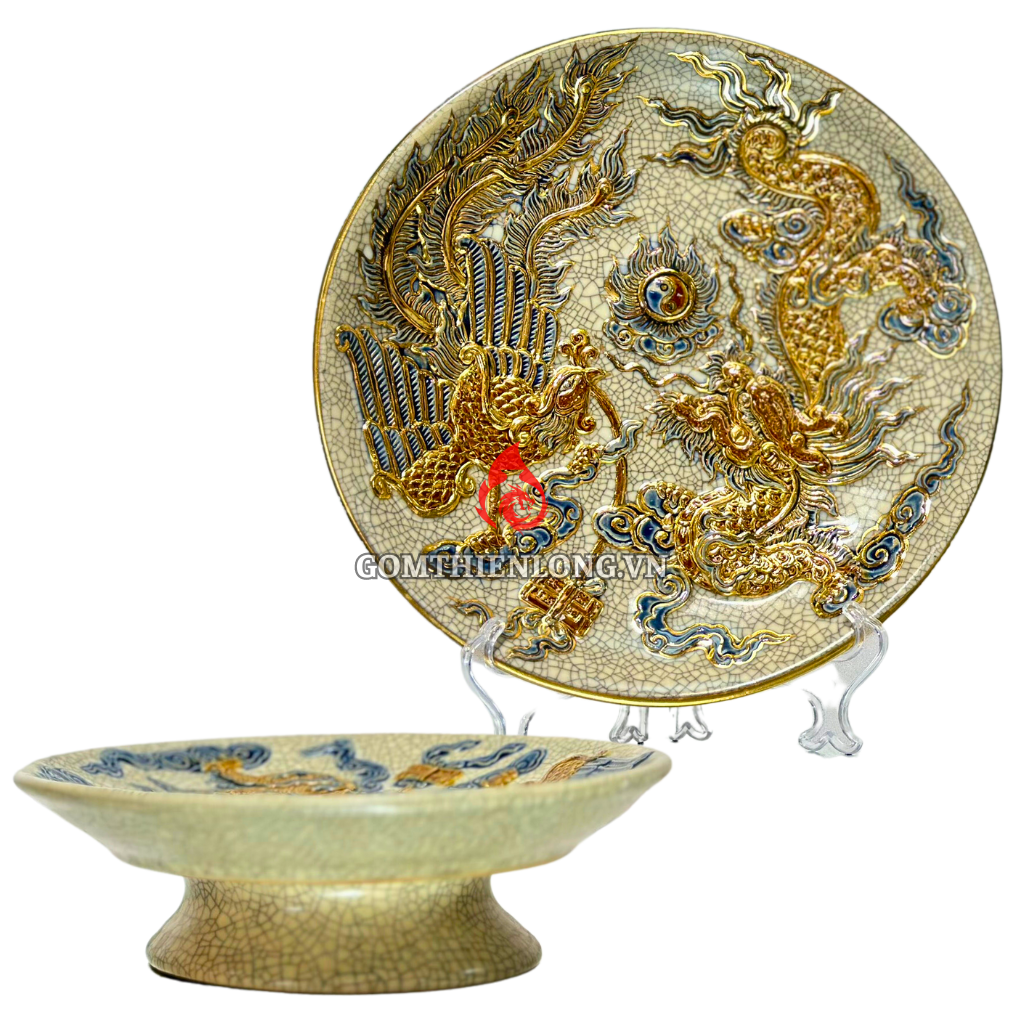 Thông tin sản phẩm Mâm Bồng Sứ Men Rạn Đắp Nổi Vẽ Vàng Rồng Phượng 231112