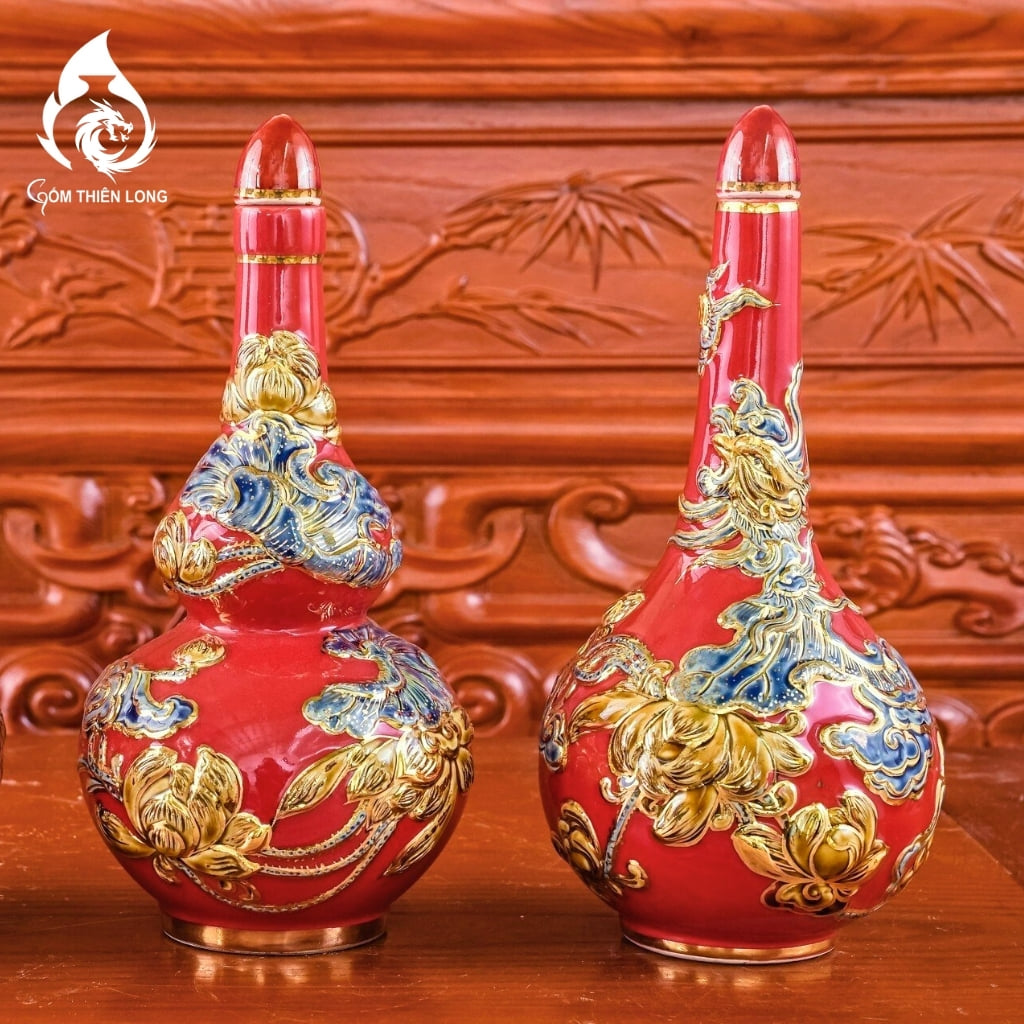 Men màu đỏ vẽ vàng hoa sen: Nậm rượu được phủ men màu đỏ vẽ vàng hoa sen, mang vẻ đẹp sang trọng và tinh tế. Các sản phẩm sau khi trải qua 2 lần nung đến nhiệt độ 1200 độ C hoàn hảo nhất sẽ được người nghệ nhân lựa chọn vẽ vàng 24k lên sản phẩm và tiếp tục nung lần thứ 3 vô cùng công phu.