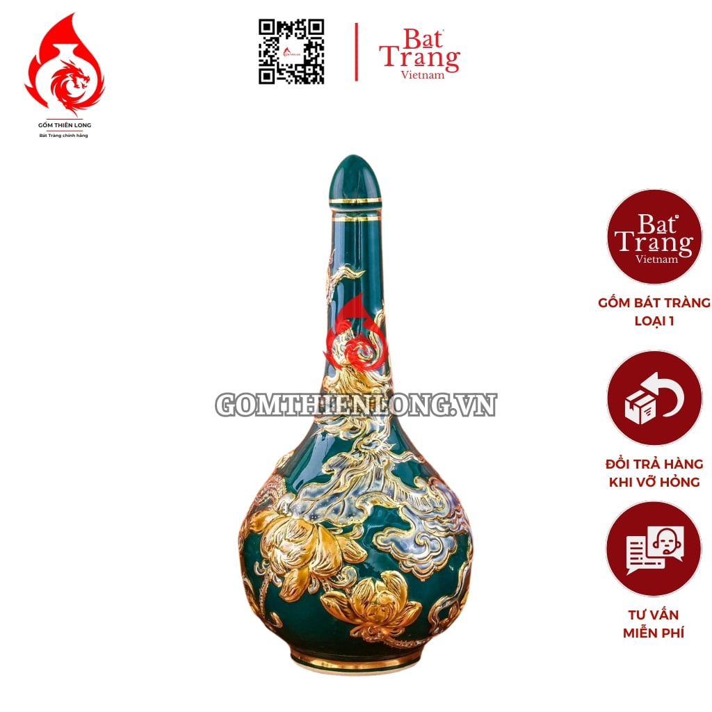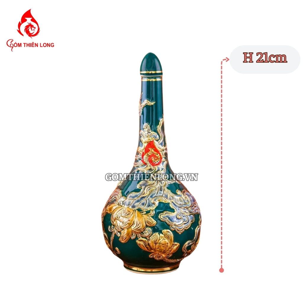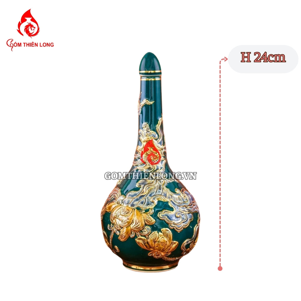 Men xanh lục bảo vẽ vàng hoa sen: Nậm rượu được phủ men xanh lục bảo vẽ vàng hoa sen, mang vẻ đẹp sang trọng và tinh tế. Các sản phẩm sau khi trải qua 2 lần nung đến nhiệt độ 1200 độ C hoàn hảo nhất sẽ được người nghệ nhân lựa chọn vẽ vàng 24k lên sản phẩm và tiếp tục nung lần thứ 3 vô cùng công phu.