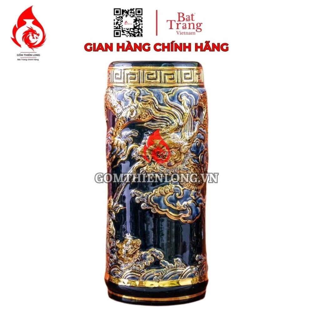 Ống đựng nhang bằng sứ men xanh tím đắp nổi vẽ vàng long cuốn thủy là một sản phẩm gốm sứ thờ cúng cao cấp của làng gốm Bát Tràng. Sản phẩm được làm thủ công hoàn toàn từ đôi bàn tay khéo léo của các nghệ nhân làng nghề, mang đậm nét truyền thống và tinh hoa của gốm sứ Việt Nam.