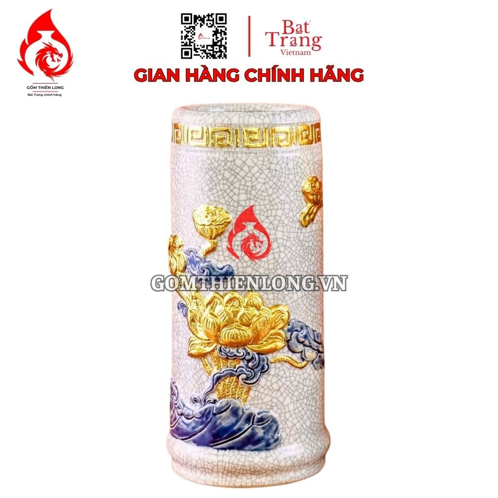 Ống đựng nhang bằng sứ men rạn đắp nổi dát vàng hoa sen là một sản phẩm gốm sứ thờ cúng cao cấp của làng gốm Bát Tràng. Sản phẩm được làm thủ công hoàn toàn từ đôi bàn tay khéo léo của các nghệ nhân làng nghề, mang đậm nét truyền thống và tinh hoa của gốm sứ Việt Nam.