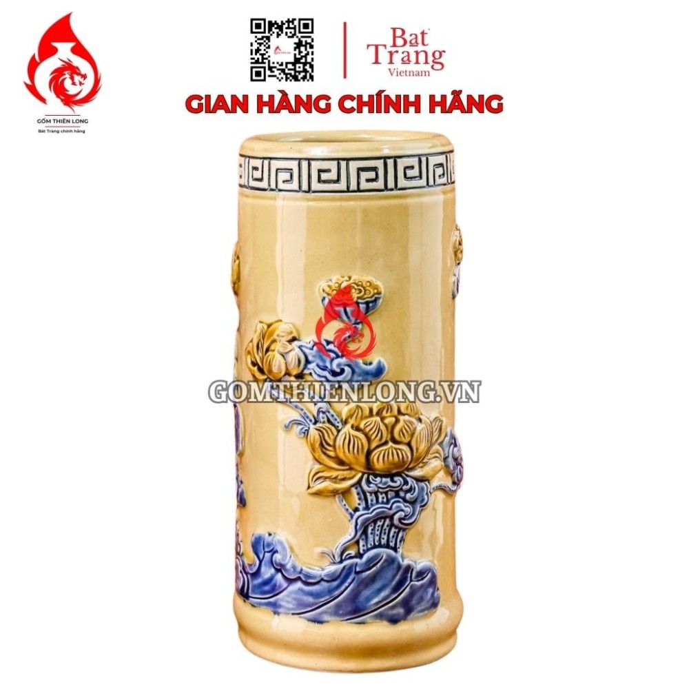 Ống đựng nhang bằng sứ men vàng hoàng tộc đắp nổi hoa sen có kích thước đa dạng, từ 18cm đến 25cm, phù hợp với nhiều loại bàn thờ khác nhau. Sản phẩm có thể đựng hương đặt trên bàn thờ gia tiên, bàn thờ thần tài thổ địa, hay bàn thờ Phật.