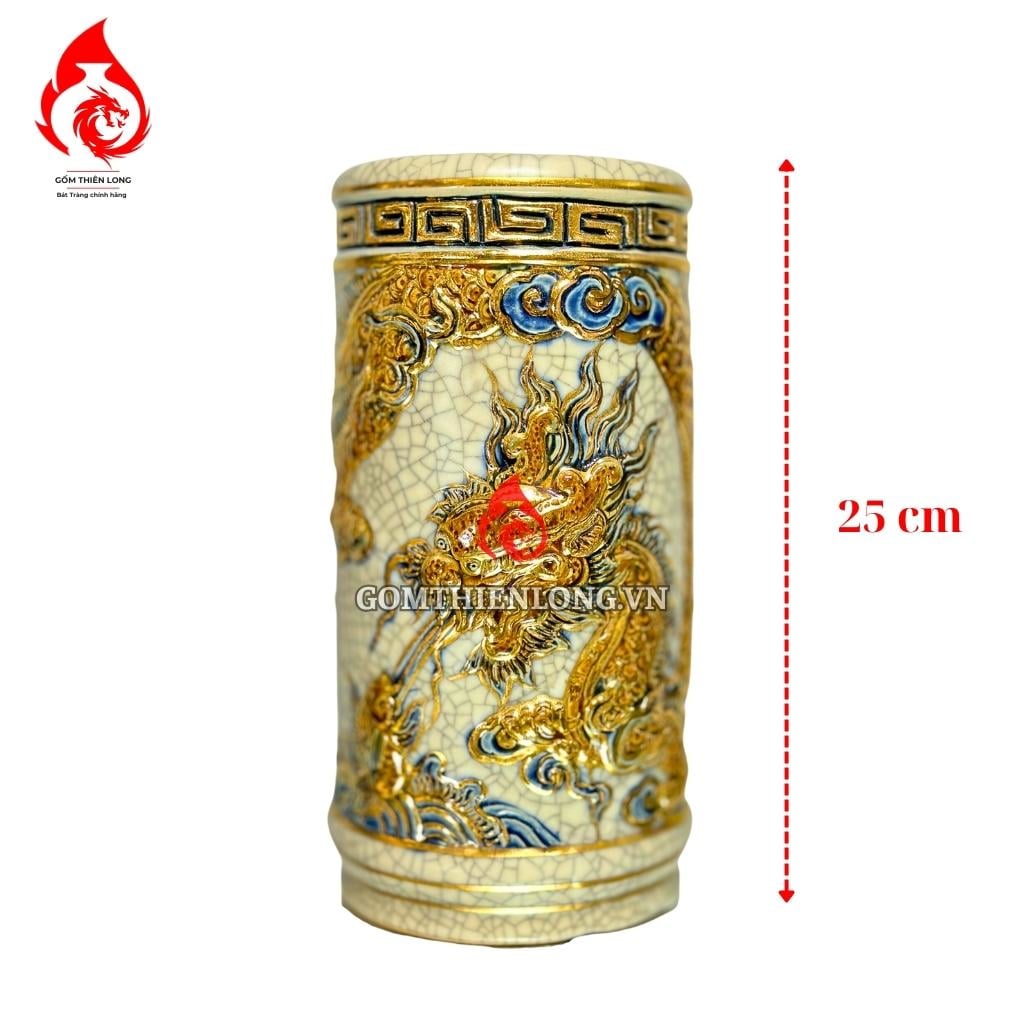 Ống Đựng Nhang Bát Tràng Men Rạn Đắp Nổi Vẽ Vàng Long Cuốn Thủy 231081