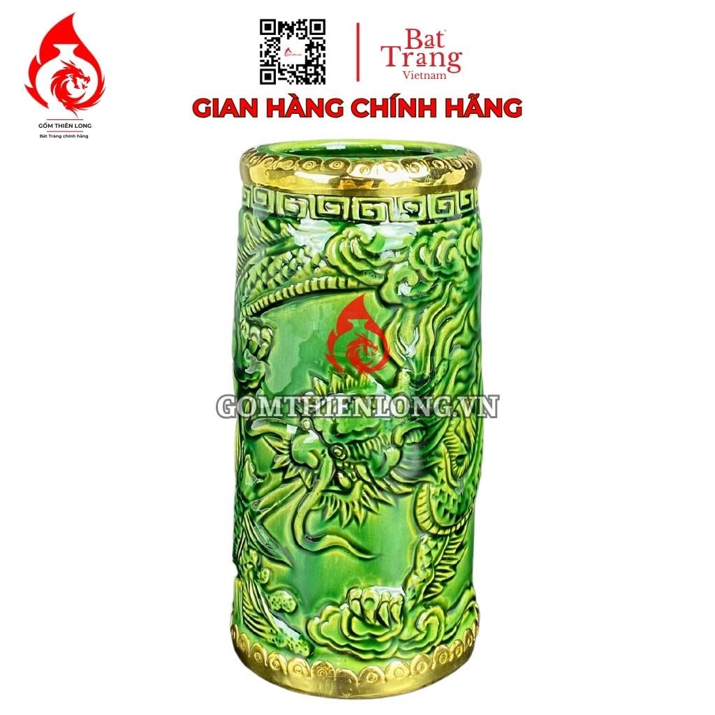 Ống đựng nhang Bát Tràng men xanh ngọc lục bảo đắp nổi long cuốn thủy có kích thước đa dạng, từ 17cm đến 25cm, phù hợp với nhiều loại bàn thờ khác nhau. Sản phẩm có thể đựng hương đặt trên bàn thờ gia tiên, bàn thờ thần tài thổ địa, hay bàn thờ Phật.